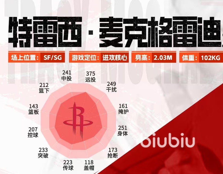 在《美职篮绝对星》中,麦迪的各项属性高度还原了其真实职业生涯的技术特点。其中最突出的是远距离投篮能力,数值高达375,展现出极强的外线威胁。此外,他的中距离投篮和干扰防守能力也分别达到241和249,整体攻防均衡。无论是篮下终结、控球突破,还是组织传球,麦迪都具备出色的综合数据,使其在游戏中成为一名极为全面的锋卫摇摆人。