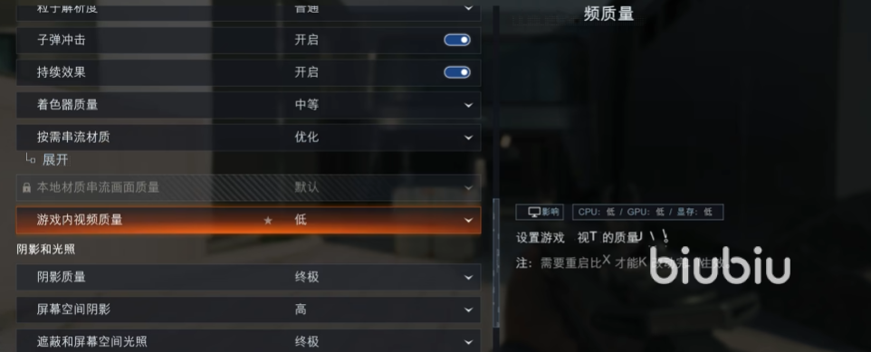 接着修改细节,将着色器质量修改成为中等,然后按需串流材质设置成为优化,景深关闭,阴影跟光照当中的设置大部分都关闭,如果想要好一点的光影响效果,开低就行了。注意,接下来的地形质量不能调整的太低,最少也要有中等,延迟物理效果质量也可以关闭,开启也就是增加碰撞感,对这方面不看重关掉可换来帧率的提高。