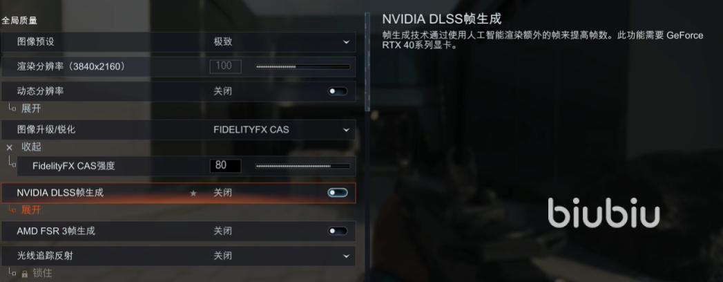 接着将英伟达dlss帧生成功能给关闭,虽然会牺牲一点点的图形运算效果,但是避免出现输入延迟的情况,在我们进行射击的时候手感会有明显的提升。继续往下拉,看到细节与材质选项栏,将分辨率调整为普通,材质过滤各向异性也设置为普通,多余的渲染效果关闭之后,会让帧率有明显提升,同时画面表现效果也够用。