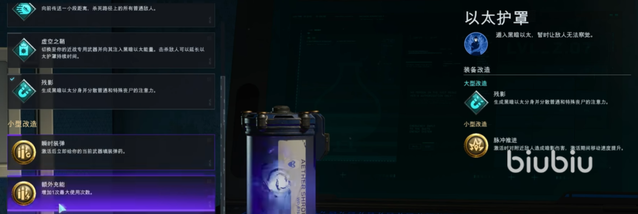 其实刷枪的重点还是要多打怪,因此我们要找到僵尸地图当中最高效的刷怪方式。在进入农场之前,需调整携带装备。我们进入装备-改造-战场升级当中,选择以太护罩中的残影效果,一定要带,后续刷怪过程中可以分散仇恨。小型改造则无所谓,按照玩家的习惯来。