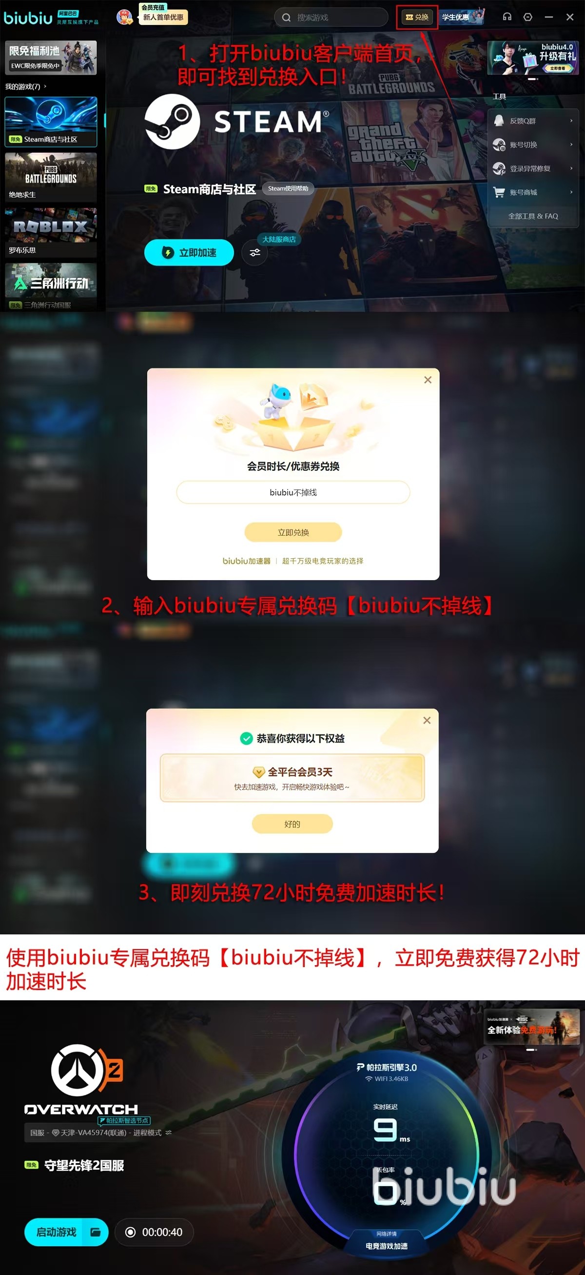 超值专属加速福利助力变形征程,注册biubiu加速器新人,即刻获得24小时黄金免费专属加速时长,再填关键助力,输入【biubiu不掉线】专属口令,便可继续驰骋联动战场72小时,新首充用户享受总福利时长高达96小时。