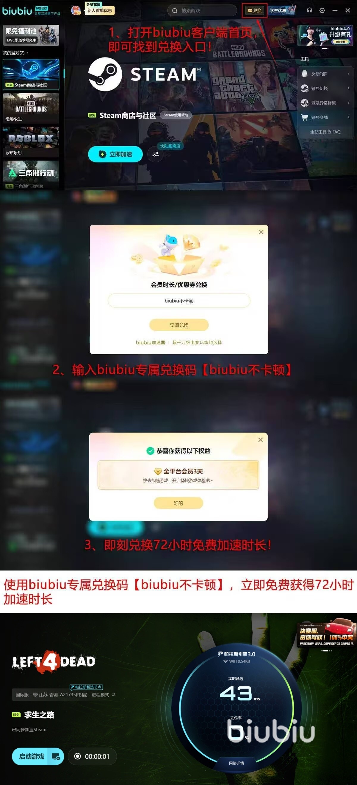 开启加速后,可明显观察到游戏延迟值持续保持在绿色安全区间,操作响应更加即时,多人配合时的动作同步性大幅提升,有效规避了因网络波动带来的卡顿与断连。目前平台为新用户提供友好试用政策,首次注册即可获得24小时免费加速权限,结束后通过输入口令【biubiu不卡顿】还可额外兑换三天使用时长,累计近百小时的体验机会,足以支撑玩家完整通关多个战役模式。