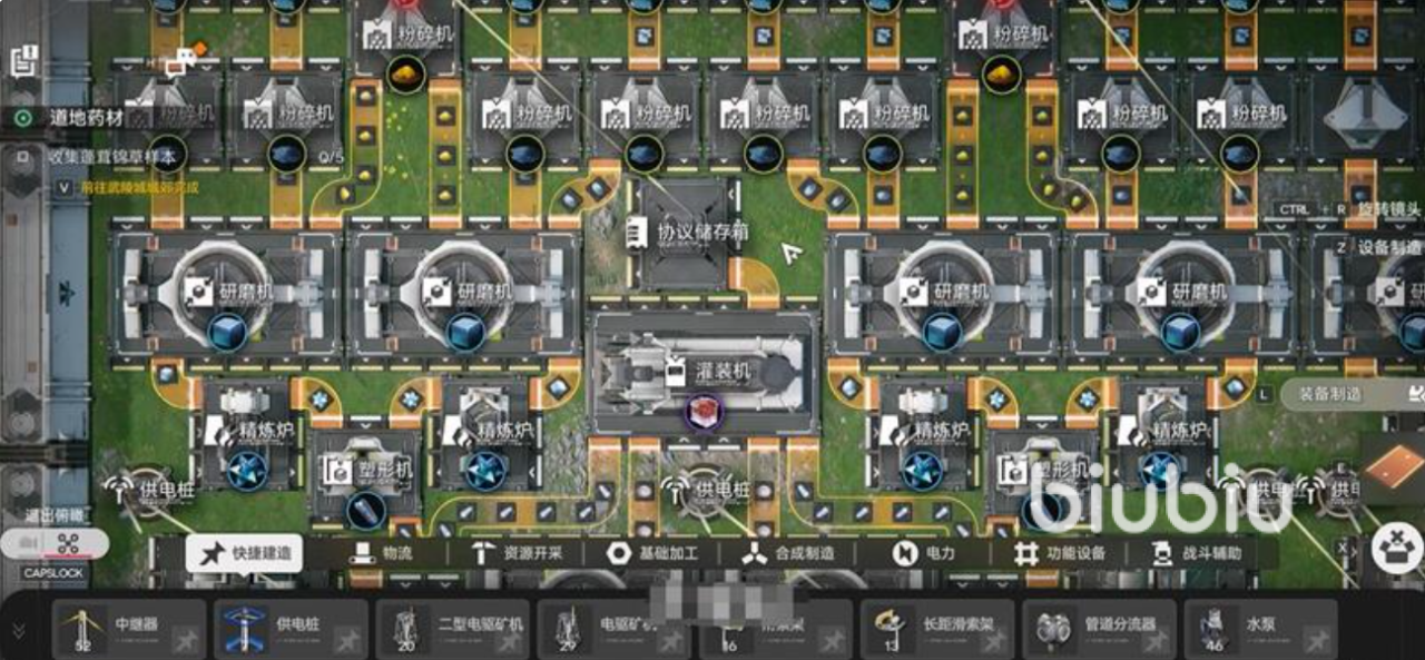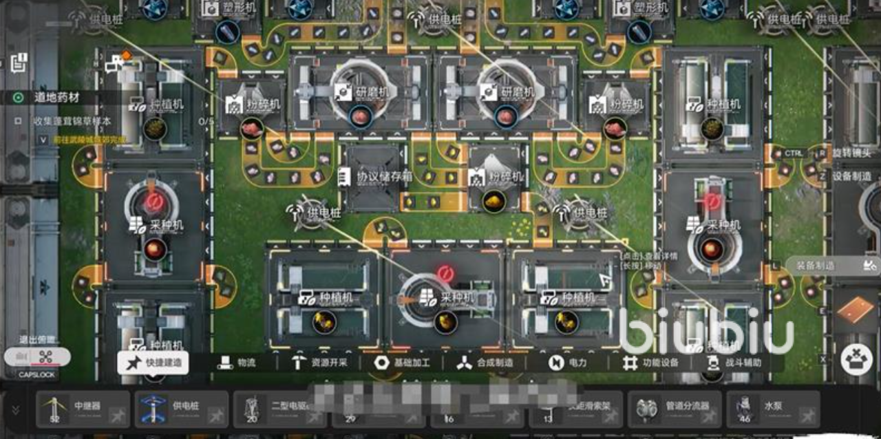 要成功运营一座工厂,必须理解三个关键组成部分:协议核心、生产模块配置以及电力供应体系。协议核心作为整个设施的控制中枢,其影响范围以黄色区域标识,所有加工设备如精炼炉、粉碎机和塑形机都需布置在此范围内才能正常运作。在开始生产前,玩家需要先解锁对应蓝图。建议初期优先建设两条基础产线:第一条由紫金矿、精炼炉、塑形机与灌装机组成,主要用于零件制造;第二条则包含种植机、粉碎机与灌装机,专用于药品生产,满足前期消耗性资源需求,为中后期扩张打下良好基础。
