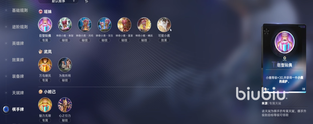开局阶段,瑶妹会召唤一只小鹿协同作战。该单位每回合基础等级提升2级;若前一回合战斗获胜,则额外再增加3级。每隔三个回合,玩家可获取一次秘技机会,用于强化小鹿,赋予其复制实体、等级共享等多样化增益效果。达到6星后解锁天赋“巨型小鹿”,直接为小鹿增加30等级,并开启伤害转移机制——瑶妹受到的部分伤害(30%)将由小鹿承担,大幅增强生存能力。