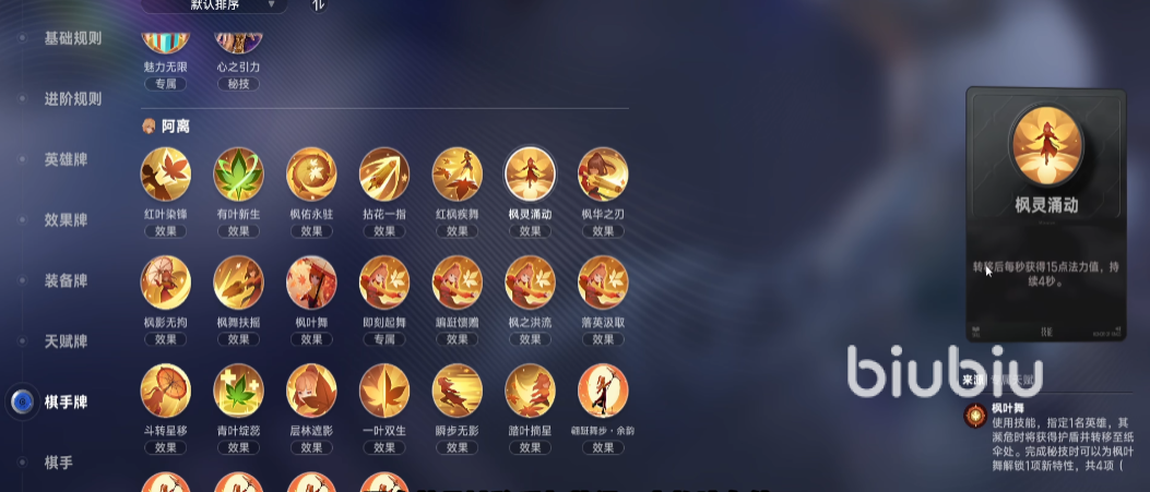 作为一名偏重战斗联动的棋手,阿离的被动允许她在释放技能时指定一名己方英雄。当该目标处于濒危状态时,会被保护并传送至纸伞位置,同时获得护盾。完成特定条件后,秘技将解锁被动的一项附加特性,共包含四种可选拓展效果。例如,“有叶新生”可在传送后恢复目标20%最大生命值,另有选项可使护盾持续时间无限延长。6星天赋则提供三个“枫叶舞”强化方案供玩家择一使用,进一步定制化战斗风格。