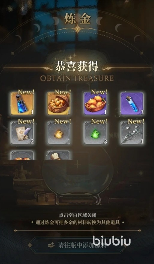 收集完材料后,进入炼金界面并选择多个材料批量合成,系统会在完成进度条达到100%时产出对应数量的物品。整个过程支持多材料同时处理,无需逐个操作,极大提升了效率。每次炼金结束后,游戏会显示本次产出结果,清晰列出所获得的道具。值得注意的是,精力药水的生成概率较高,平均每十几次炼制就能获得一瓶,长期坚持可积攒可观库存。