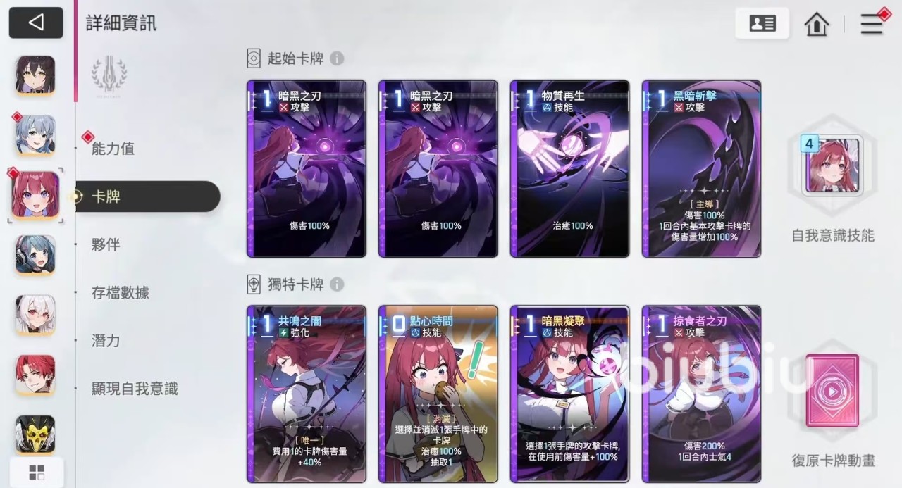 蕾伊初始携带两张一费攻击卡与一张一费技能卡。攻击卡“暗黑之刃”可造成106%的基础伤害,适合前期稳定输出;技能卡“物质再生”则根据自身的防御属性恢复生命值,治疗量还受当前压力值影响,具备一定的生存保障能力。在特殊卡牌方面,她拥有五张核心卡牌,每一张都具有战略意义。
