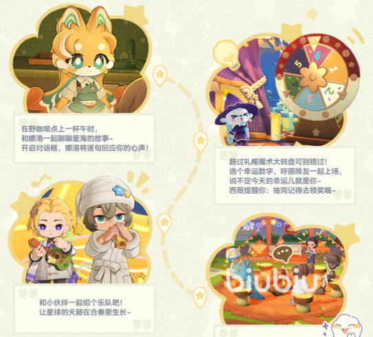 当果冻数量累积到一定额度后,便可前往兑换点换取多样惊喜好礼。兑换货架上陈列着丰富的物品,包括独特的角色动作、稀有的瞳色变化道具,以及多种风格各异的乐器。使用这些乐器可在移动中奏响星海乐章,让每一步都伴随悦耳音符。想要尝试运气的玩家还可以用果冻兑换礼帽魔术券,参与幸运转盘抽奖,有机会赢得高价值奖项。除了物资奖励,在街市中的野咖啡座还能与NPC娜洛对话,点上一杯饮品,倾诉心中疑问,感受片刻宁静与温情。