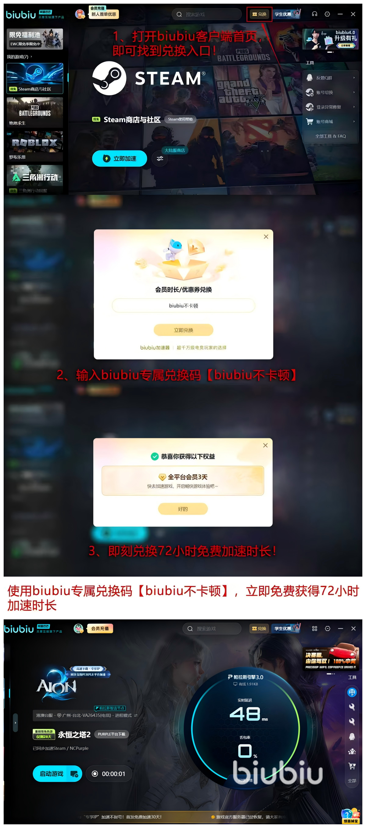 除了限免的活动之外,选择biubiu加速器在兑换的界面输入【biubiu不卡顿】口令,则还能再得到72小时任意游戏加速时间,搭配上赠送的24小时新手时间,总计能够得到96小时的任意游戏免费加速时间,可以和上面的限免活动叠加,让各位玩家获取超长的免费游玩时间,所以热爱这款游戏的玩家一定要记住口诀。