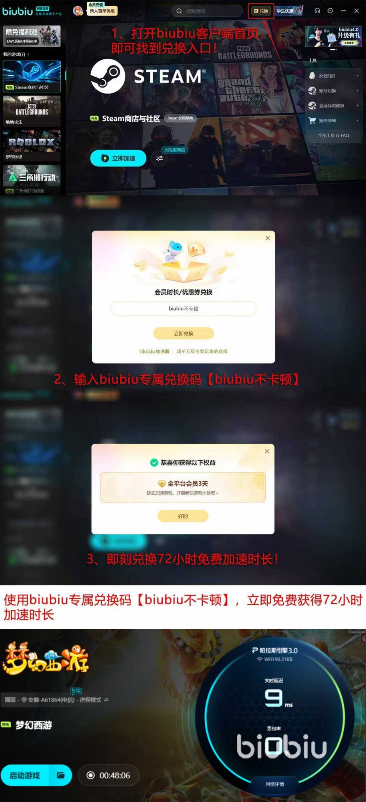 这么好用的加速器,新人福利必须安排到位!知道大家都想亲自试试先,所以平台呢直接给每个新注册的用户送上了一整天24H的免费体验时间,到底好不好,大家一用便会知道,biubiu加速器有这个自信心哦!为了答谢大家长久以来的支持,现输入专属兑换码【biubiu不卡顿】,还能得到72H的免费加速时长,合起来直接就有四天呢!