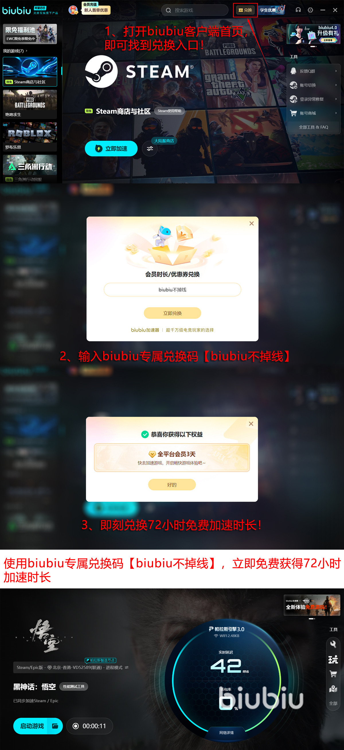 惊喜福利助开荒,biubiu加速器为新用户准备了丰厚礼物,立即注册账号就能获得早期联机冒险24小时,别忘了输入独家口令【biubiu不掉线】,兑换成功之后还能继续尽情战斗72小时,新用户专属福利叠加使用,爽享总计长达96小时的顶级加速体验。