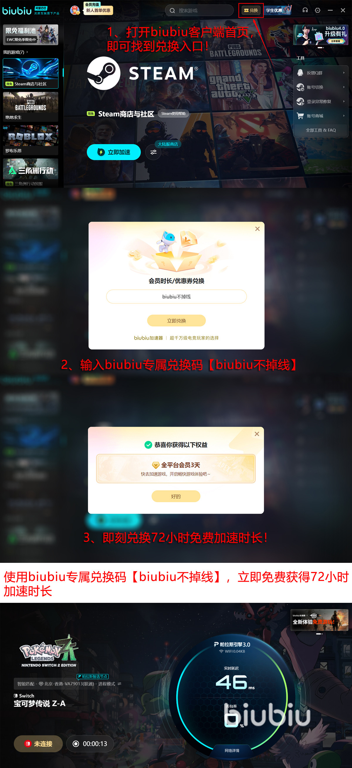 此刻加入biubiu,新玩家注册即送双倍大礼,免费获取全新冒险体验24小时,输入【biubiu不掉线】专属口令后可轻松冲刺异次元72小时,新用户累计可达96小时的优质加速体验,为即将开启的宝可梦传说Z-A超次元爆涌DLC探险之旅铺就高速赛道。
