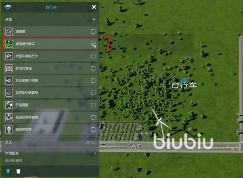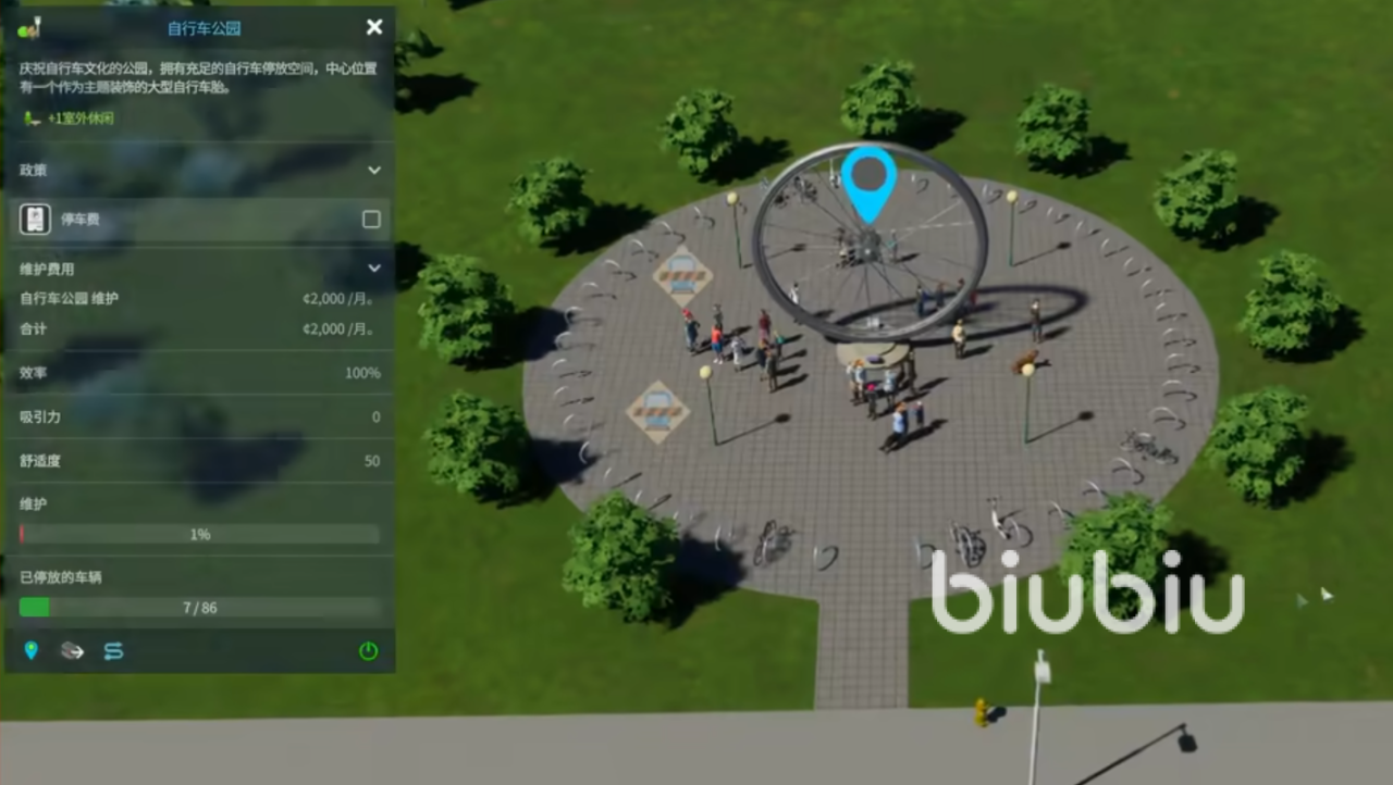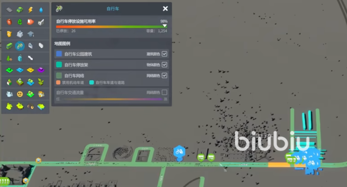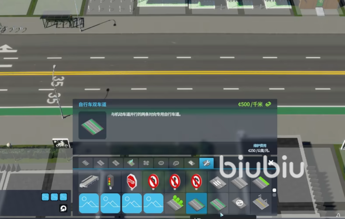 基础设施中,停车设施提供路旁的自行车架、自行车棚、停车大厅等9类停车位。通过“道路服务”可以添加自行车道、双侧自行车道、自行车限制车道。在“景观”选项卡中新增单向/双向自行车路径、分离式人车公用路径、斜拉桥、拱桥等特色桥梁建筑。