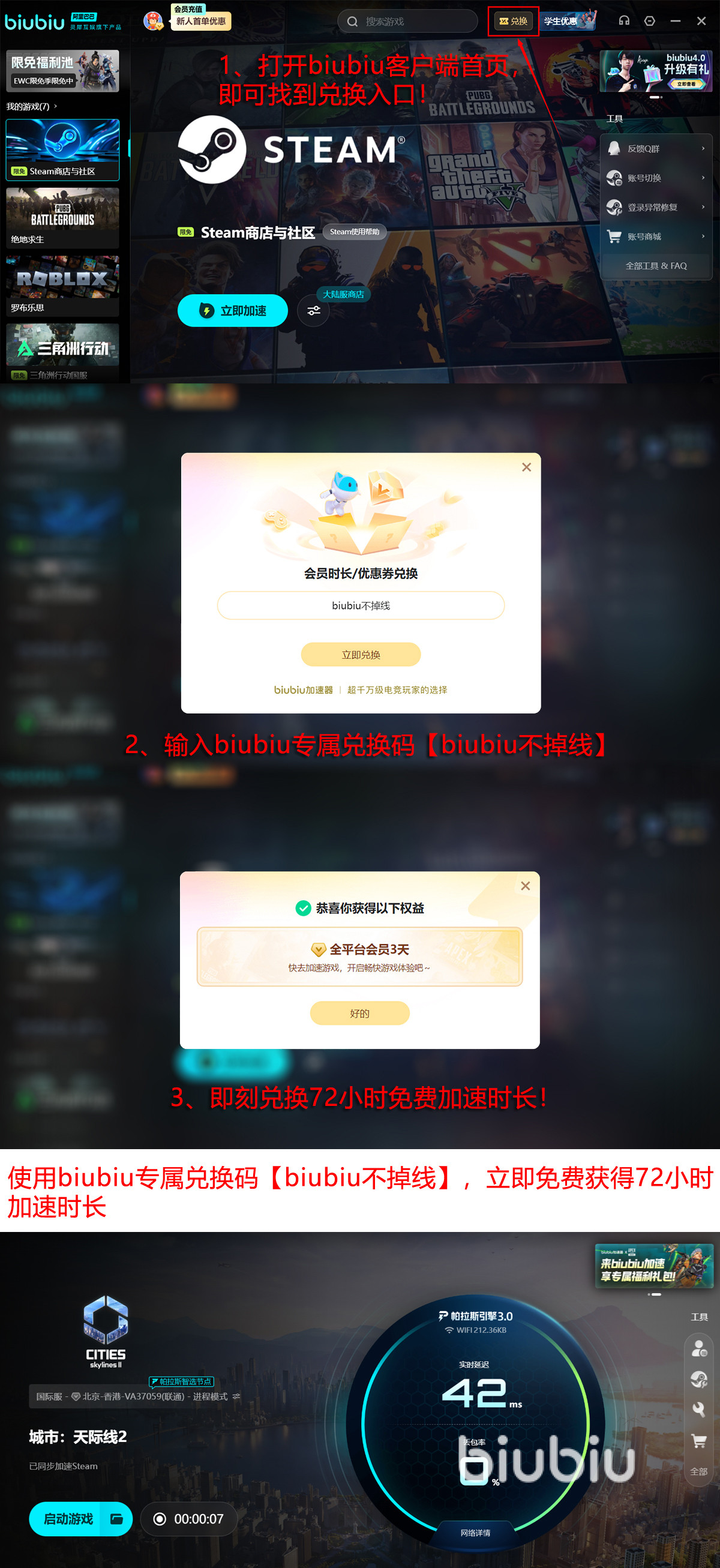 现在biubiu为了让更多的人了解到自己,特别推出专属福利包,【biubiu不掉线】这个密钥就能兑换得到72小时了,如果还是首次注册,那系统会再额外为您充入24小时,加在一起就是整整四整天。