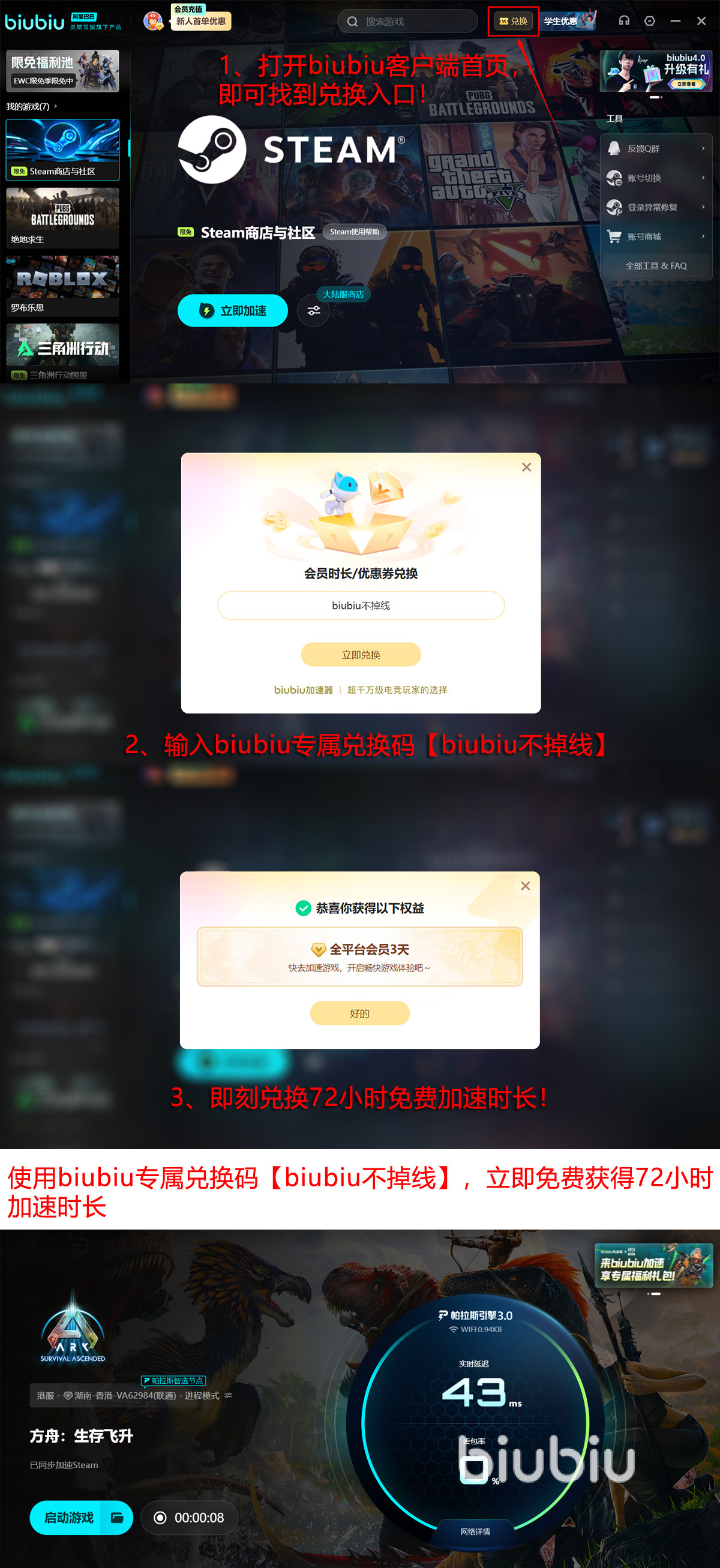 同时,biubiu豪送96小时提速福利,只要输入【biubiu不掉线】即可领取72小时免费时长,注册成功立享24小时会员特权。双重礼叠加使用,让你连续畅享极速网络,征战快人一步。