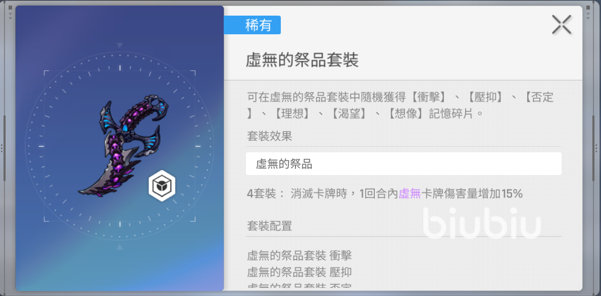 偏好持续稳定输出的玩家,可选用秩序的弹药套装,其效果为秩序卡牌伤害提升5%,最高可叠加三层,且获取途径较为简便。而对于依赖虚无属性卡牌的角色,则更适合装备虚无的祭品套装,直接增加15%的虚无卡牌伤害。