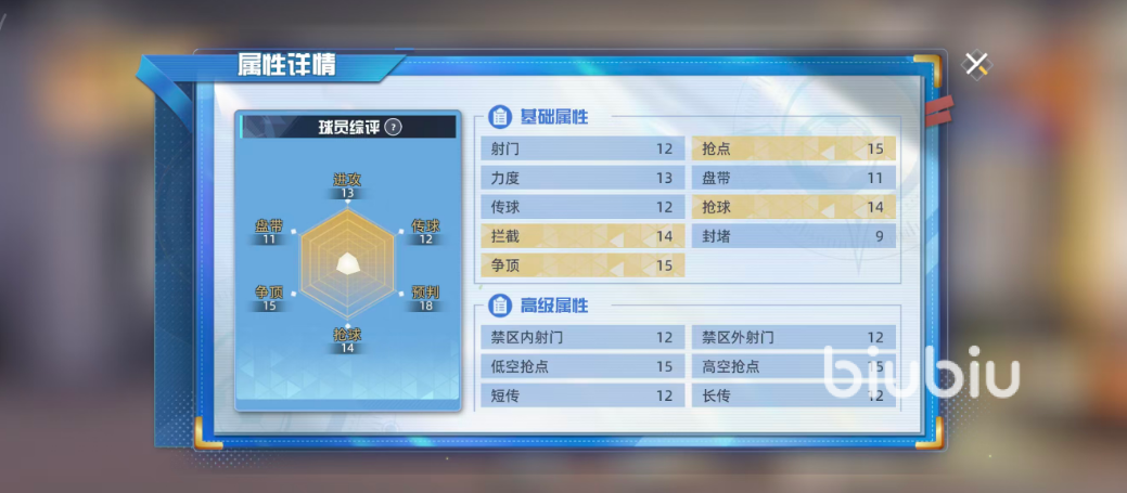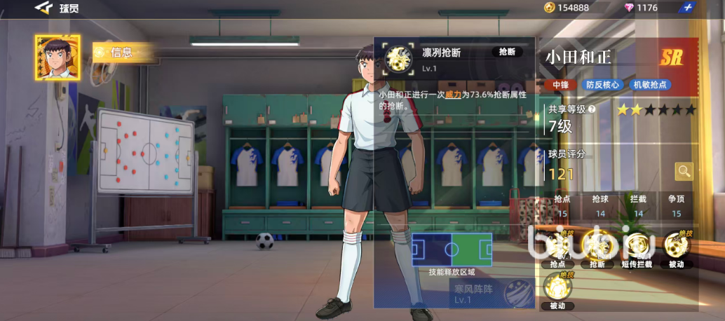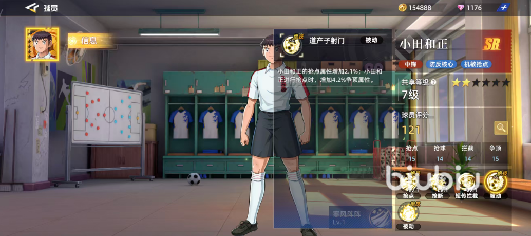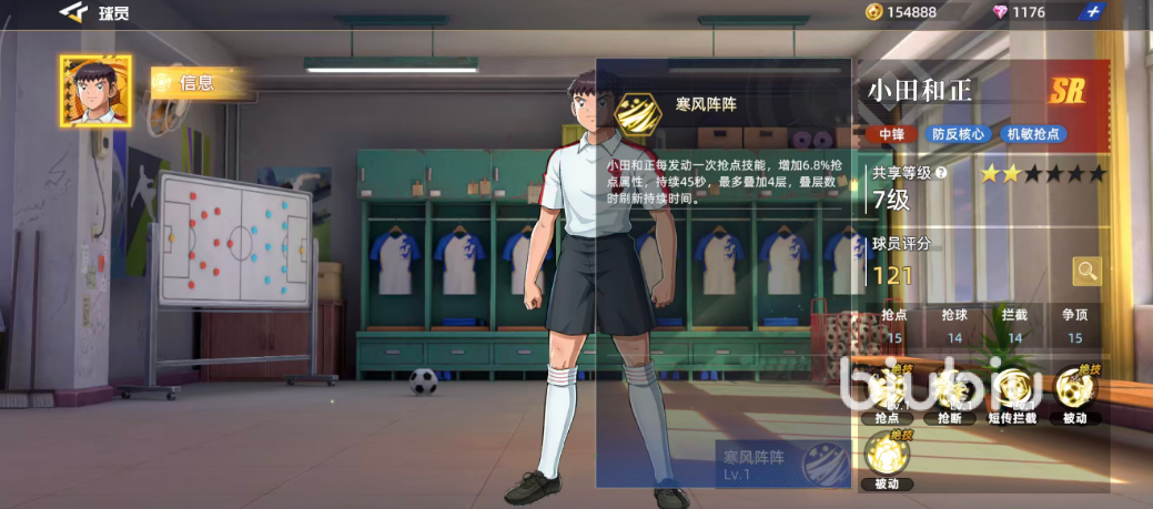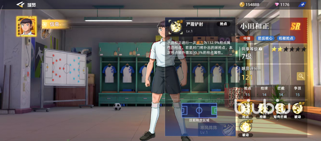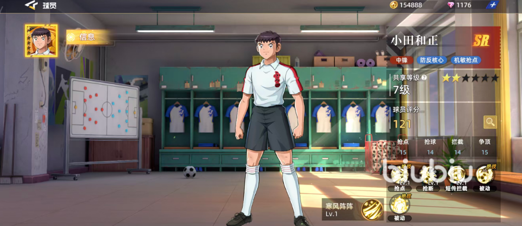 小田和正是游戏前期就能获得的SR级球员,定位为中锋,整体能力偏向防守反击体系中的关键角色。他的基础评分为121,在同品质球员中处于中等偏上水平。具体属性方面,抢点15、抢球14、拦截14、争顶15,显示出他在空中对抗和前场接应上的优势。虽然六维图中抢球能力稍弱,但其余属性分布较为均衡,适合承担战术支点任务。