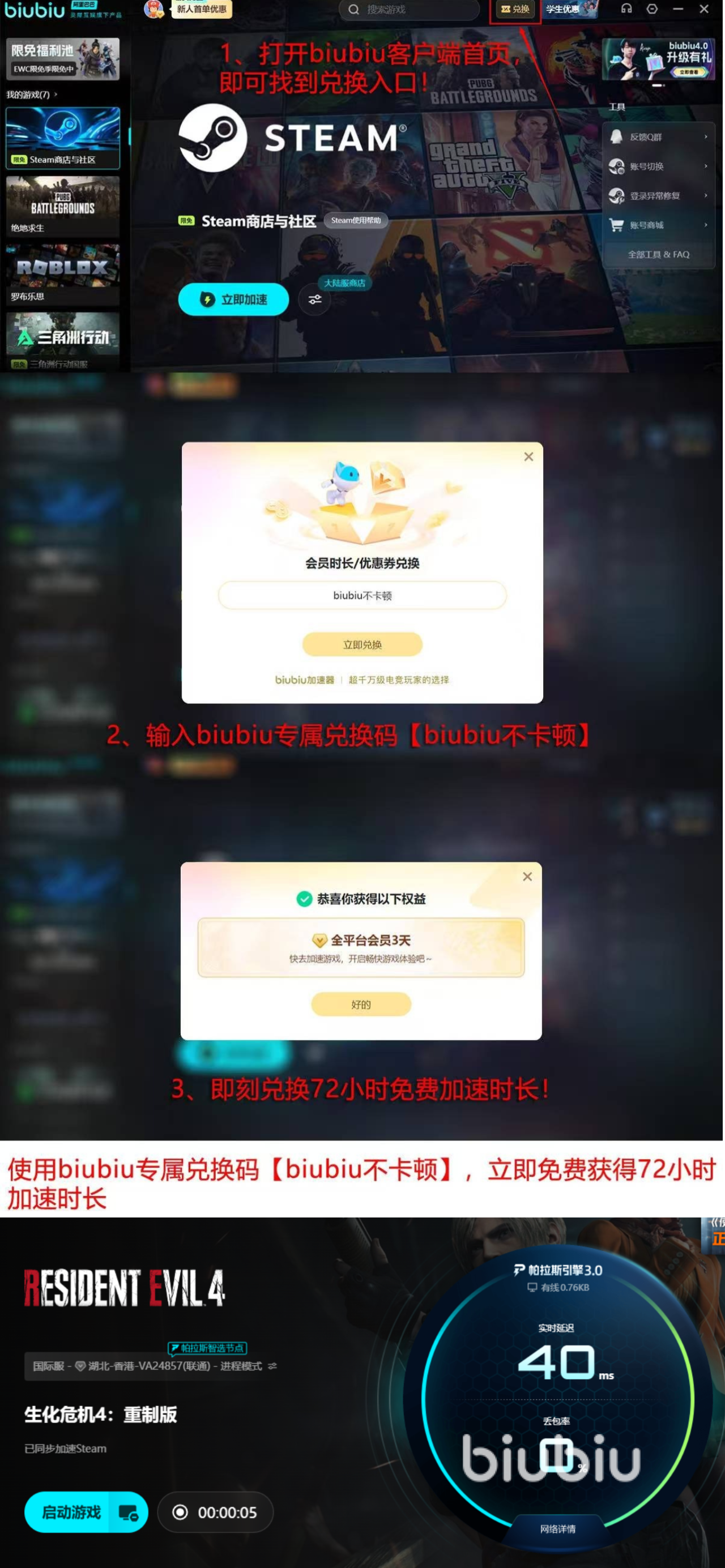 除了提供较为先进的提速技术之外,平台还给大家提供了不少的福利,让小伙伴们可以在不花钱的情况下就先实际的感受提速效果。新人登陆就可以得到24h免费提速,不用领取,平台自动放入用户账户。同时大家还可以通过【biubiu不卡顿】额外到手三天体验时间,这是每个用户都可享受一次的福利,大家根据个人的休息时间拿到手即可,暂时没有领取时间限制。