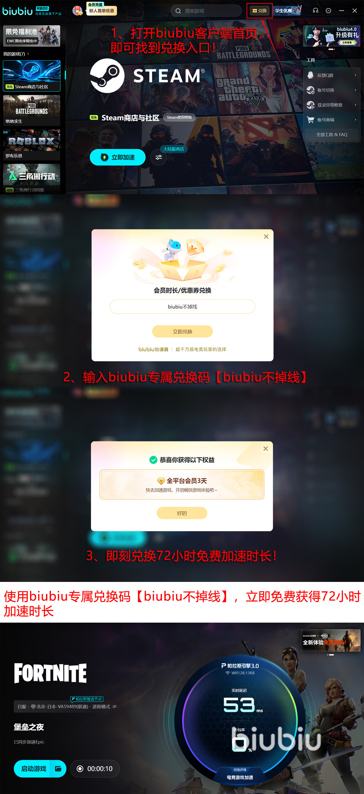此外,所有用户只需在平台首页输入【72小时免费加速时长,新用户首次注册还可额外获得96小时免费畅用。