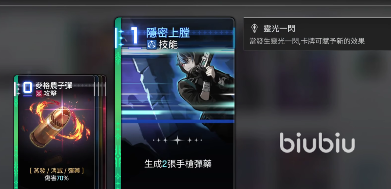 第二张专属卡“隐秘上膛”可在战斗中为玩家提供两张手枪弹药,增强后续技能衔接流畅度;第三张卡牌则赋予角色100%最大生命值的护盾,进一步强化防御能力。当使用任意弹药类卡牌时,基础伤害将提升至120%,显著增强输出效率。第四张卡“魔眼乱舞”的伤害会随着使用的弹药卡数量递增,实现伤害叠加,适合在资源充足时打出高额连段爆发。