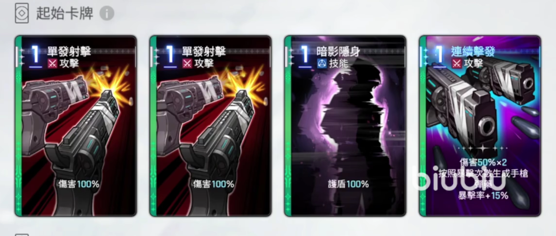 路克的卡牌系统由初始卡牌与特殊卡牌构成。初始配置包含两张普通攻击卡,每张可造成100%的基础伤害,另一张为消耗1点能量的技能“暗影隐身”,使用后能为自身附加护盾,提升战场存活率。而在专属卡牌方面,其第一张独特卡牌支持连续打击,每次攻击造成50%伤害,并依据暴击次数生成手枪弹药,同时提高15%暴击率,展现出极强的资源积累与爆发潜力。