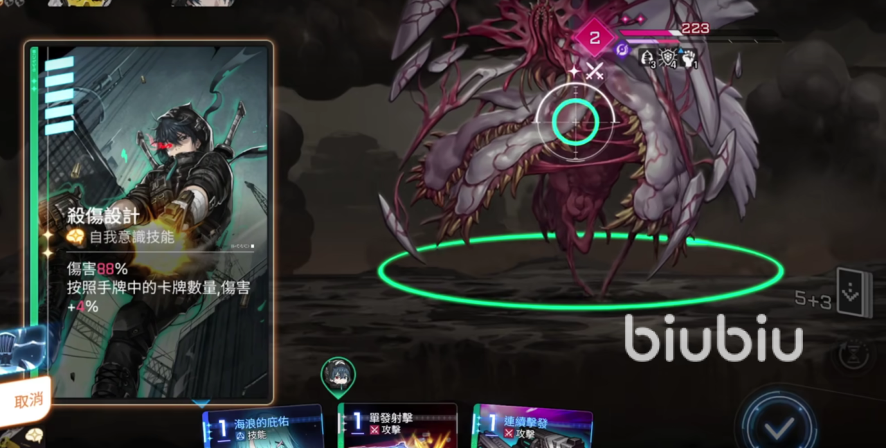 第五张卡为其终极技能,基础伤害为100%,且实际输出会根据已使用的攻击卡数量动态增长。释放大招时,最终伤害可飙升至250%。值得注意的是,该技能的增益效果依赖于弹药卡的使用情况,而非剩余卡牌数量。因此,在释放大招前建议优先清空手中弹药,以确保伤害最大化。