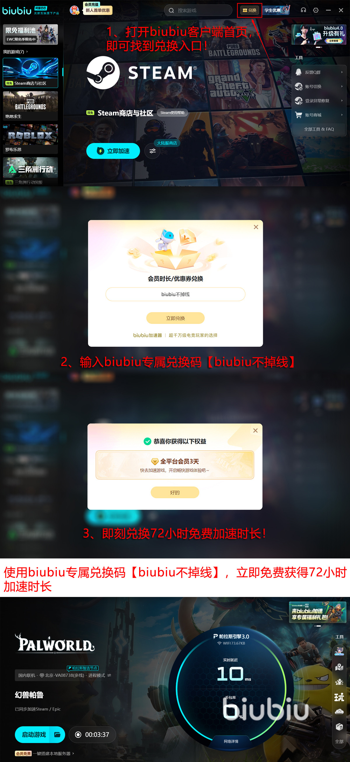 现在注册就送24小时全平台会员,再输入口令【biubiu不掉线】,还能额外再领3天!叠加起来直接白嫖96小时提速时长,足够你畅爽体验整个新版本!