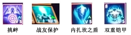 挑衅是核心嘲讽,然后其他三个都是保护类的,双重铠甲可以减伤,还可以换成【保护盾牌】,这个是高格挡。属性主要堆防御、生命、格挡,作为T就一定要拉稳仇恨。