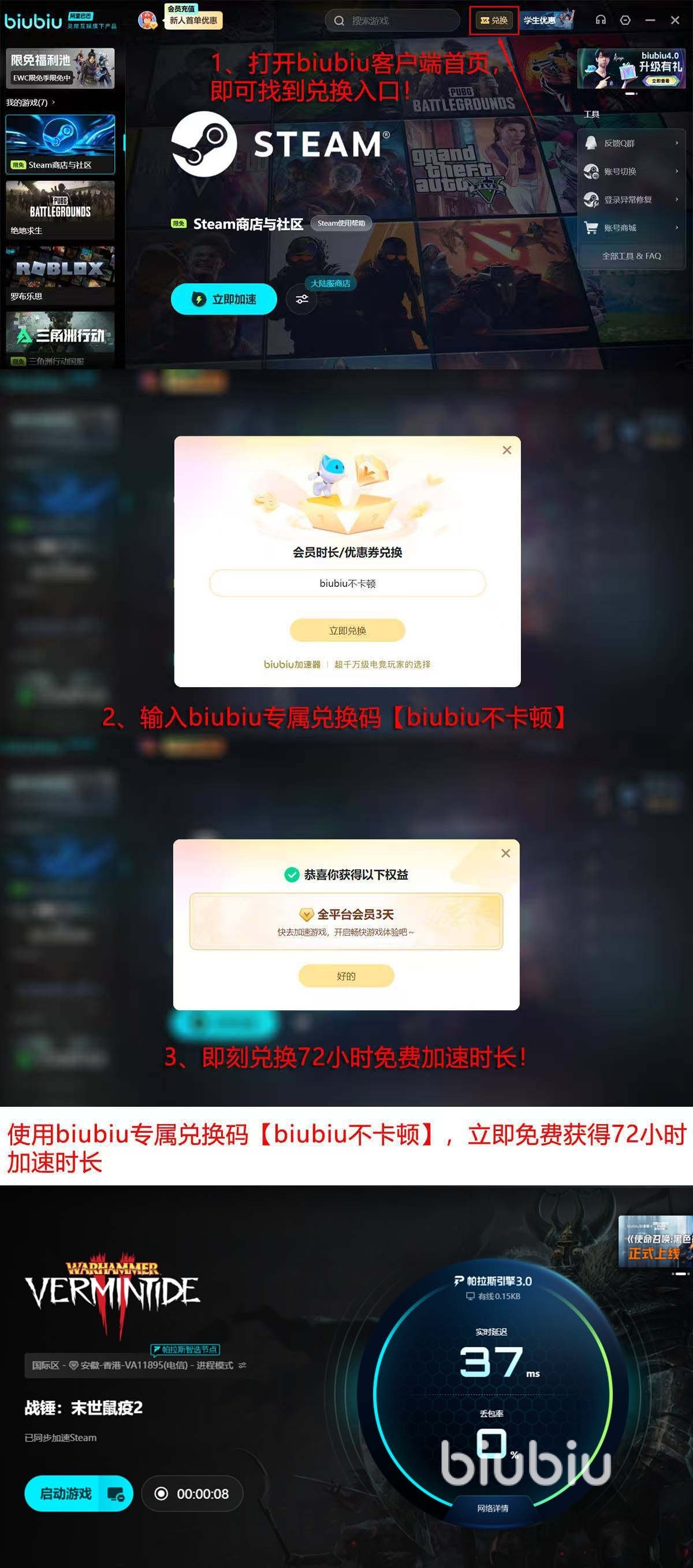 通过biubiu加速器的加速之后,一卡一顿的发生频率,掉帧和掉线的可能性都大幅减少。对于这样的游戏体验,大家一定很想亲身体验一下,当然如果考虑成本呢,现在biubiu给提供免费体验的机会,只要成功注册,就能立刻得到24小时新人免费福利,作为会员再参与老会员可使用的【biubiu不卡顿】口令,在首页又能兑换到72小时福利,这样的话,新人叠加的福利就直接有96小时,无论是老会员时间还是新人福利时间内,全平台数千款游戏都能免费加速。