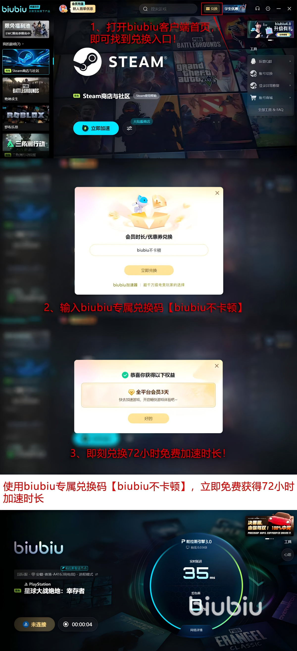 biubiu还对大众开展了免费试用活动,让大家可以无成本体验服务水平。这会最好去下载账号,凡是首次登录的新人,都会得到免费的24小时服务时间的,然后记得用兑换码,【biubiu不卡顿】可换到额外的72小时加速时间,这个是新老用户都能去领的,也就是新人其实一口气可以得到免费的96小时服务时间,慢慢享用。