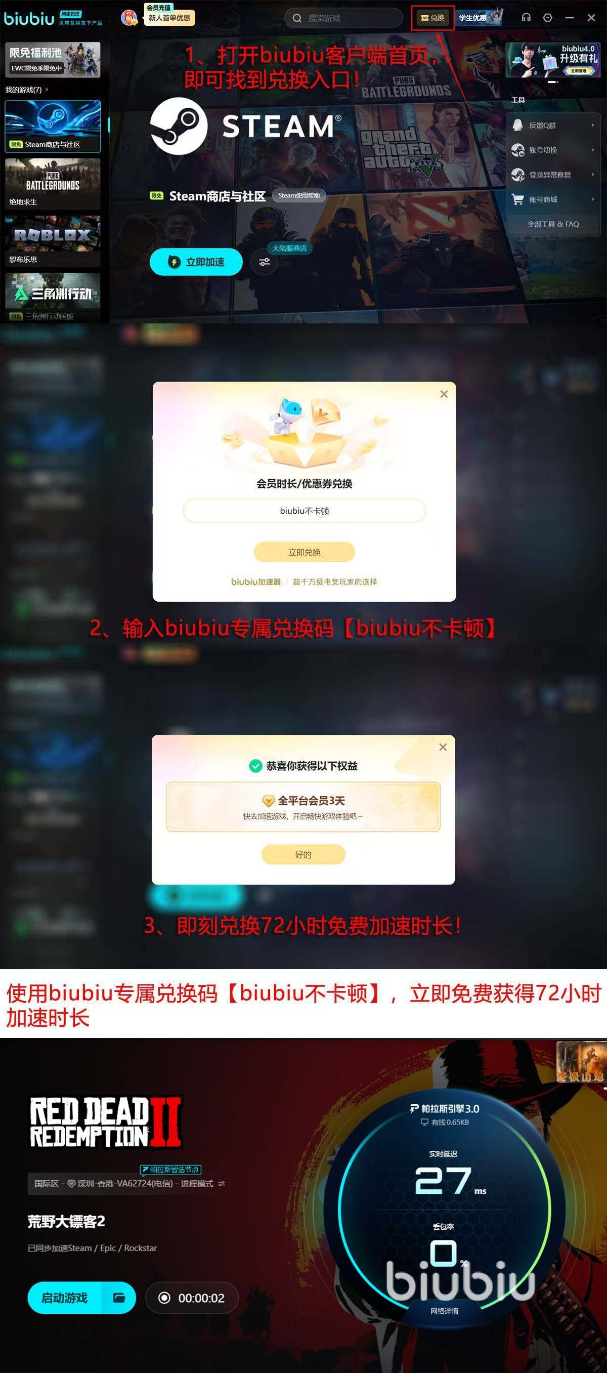 在加速器提升后,射击的稳定性和及时响应性得到体现,移动走位也不会出现延迟和掉帧的情况,大家如果想要体验,现在还能免费获得至少4天加速时长,可尽情玩平台千余款游戏。大家只需要先注册一个biubiu账号,注册成功后就能立即获得24小时免费时间,称为会员后还能参与老会员口令兑换活动,复制【biubiu不卡顿】后在首页能直接获得72小时免费加速时长,因此新人能得到的为96小时,也就是4天时间。