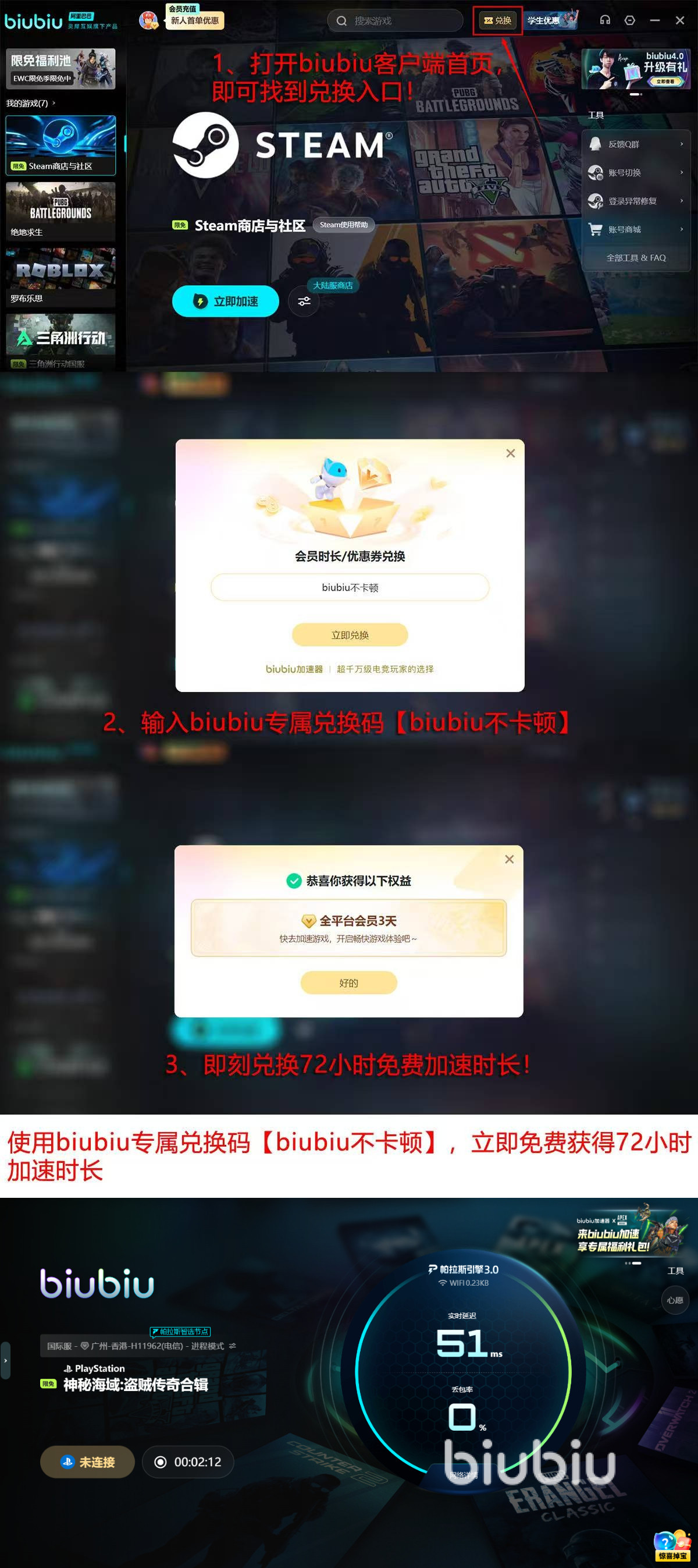 这次更新让加速更强大,但是看到之后才能放心,biubiu为新用户准备了礼物,主要注册就能享受免费尝鲜24小时,并且有额外的好礼等待领取,输入专属口令【biubiu不卡顿】还能继续加速荒野竞速72小时,总计可以达到96小时的免费时间,这足够支持一次完整的印度西高止山脉探险或者马达加斯加荒野竞速,在这样的高强度下检验自己的稳定实力,不用担心试错成本,现在就是告别卡顿的最佳时刻。