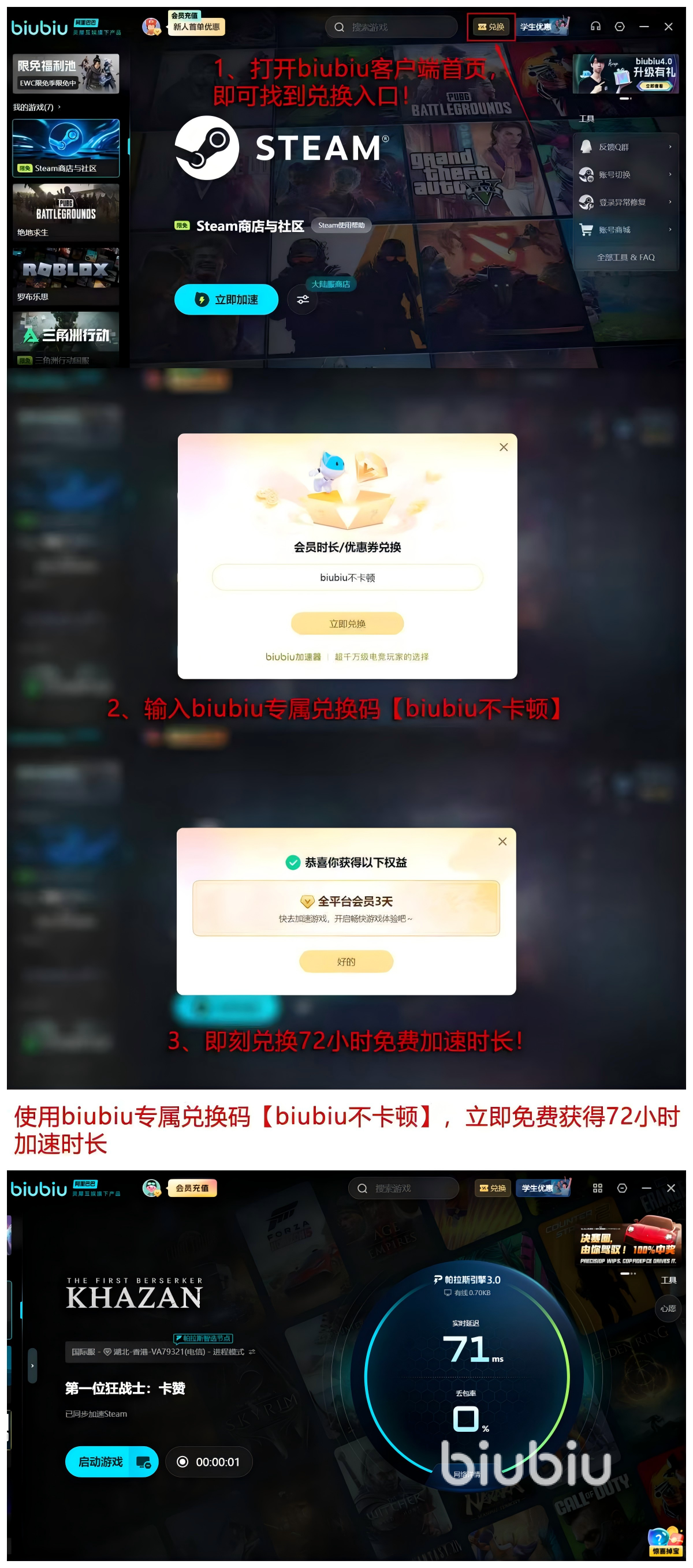 【biubiu不卡顿】输入下面的端口可以获取72小时的免费游戏时长,对于很多玩家来说就是一次体验加速质量的机会,并且新用户的24小时的体验不重叠,总计96小时的免费时间,可以说是白送玩家的。让还没有用过的玩家能够感受这款加速器的与众不同,能够凭借自己用过之后的感受来购买游戏,对于很多玩家来说非常的不错。