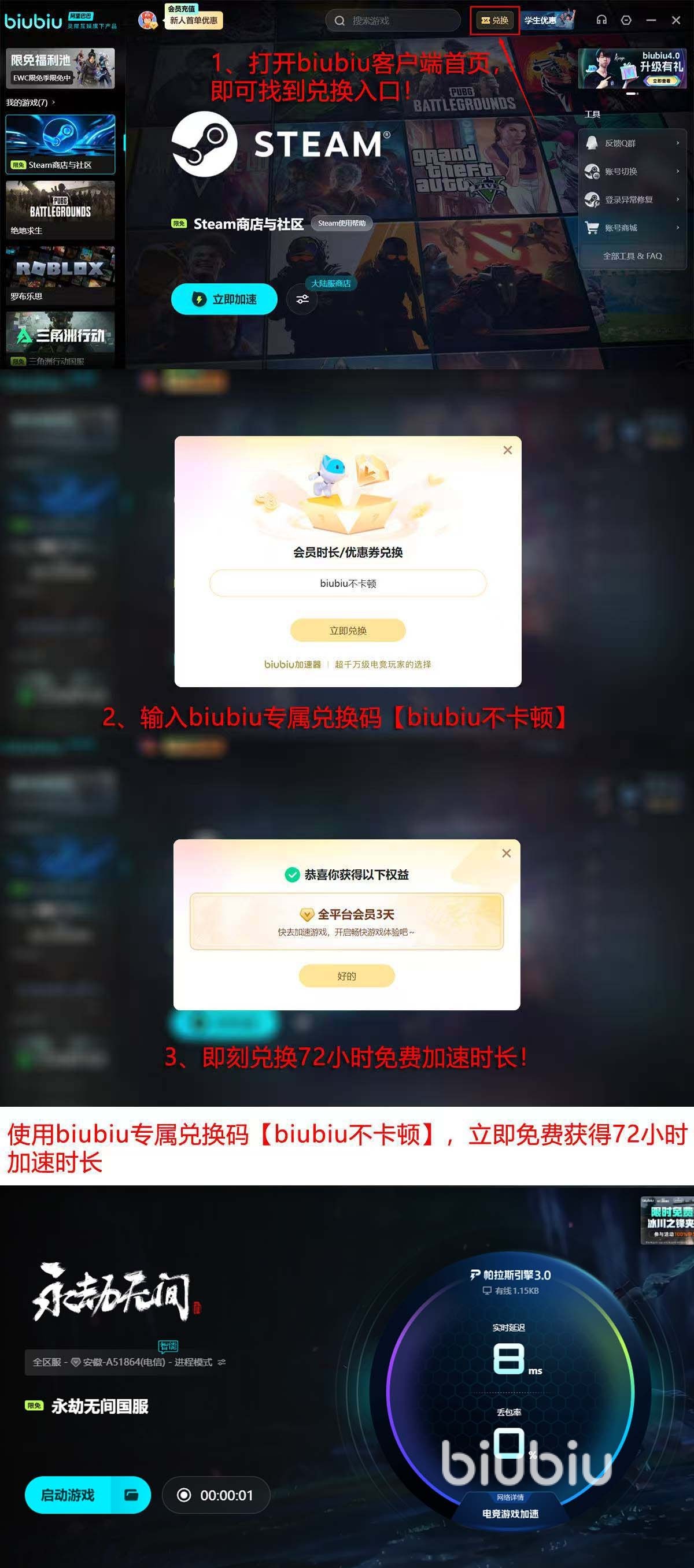 现在biubiu加速器经过升级后,加速效率和提速响应速度都得到极速提升,大家在释放境内,战斗的走位都能得到大幅提升,大家如果想要体验,现在还有免费体验的机会,主要是新注册的新户账号,注册后就能立刻得到系统赠送的24小时福利免费时长,之后,老会员可领一次的口令福利活动——即新手玩家和老会员用【biubiu不卡顿】兑换码在首页还能再领到72小时福利,新人能领到96小时。