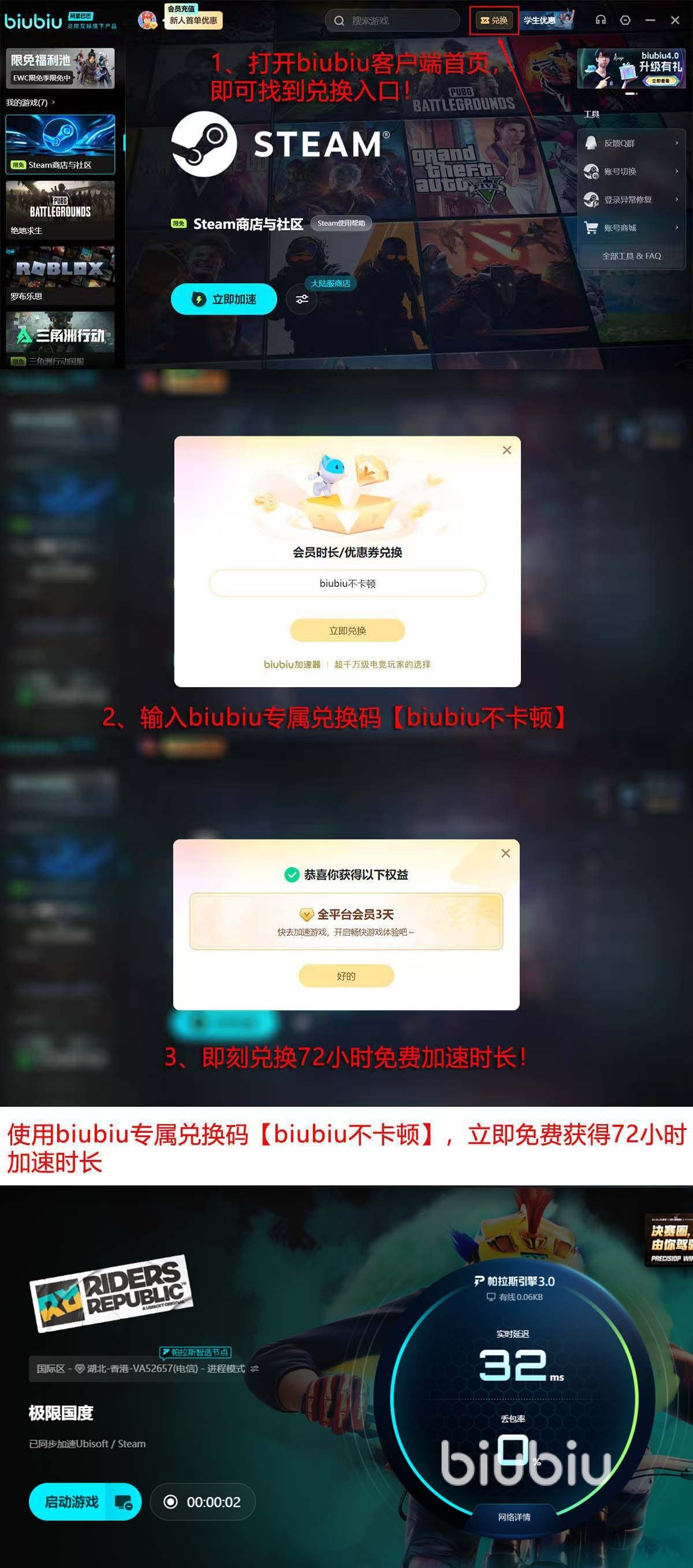 在biubiu优化了网络之后,大家玩起就会流畅,速度变的更稳定。现在官方还提供了免费体验机会,让大家0成本就能到最佳加速效果,那么怎么得到免费加速机会?很简单,注册完成后就能直接获得24小时免费时长,成功成为会员之后,还能再参加会员口令兑换活动,即用【biubiu不卡顿】口令,在首页就能兑换到72小时免费时长,新人整体上就能得到96小时,且叠加不对消,而且所有免费时间内,大家可以免费对全平台的所有游戏加速。