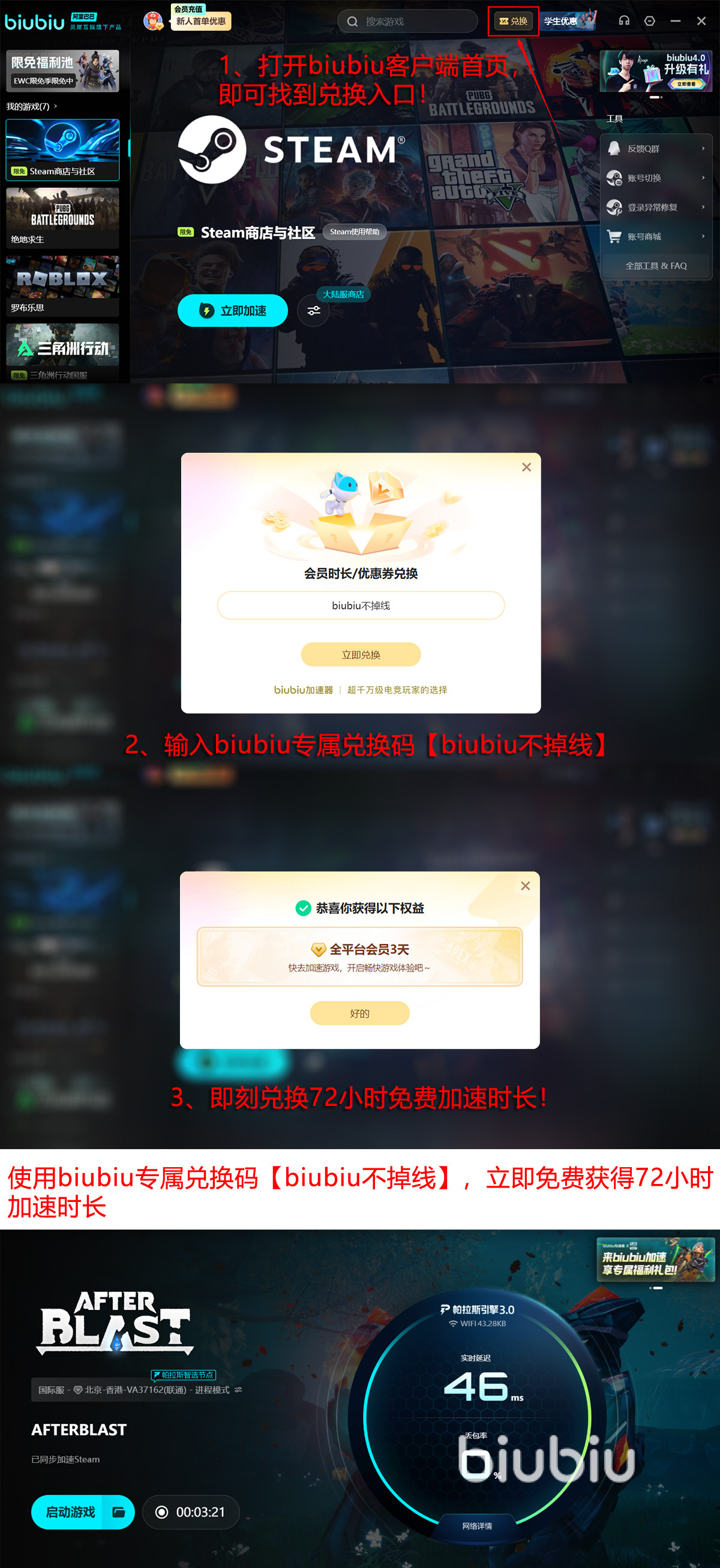 新玩家入局就有重磅福利,当前注册账号就能得到免费的VIP级别尊享加速服务24小时。更让人惊喜的是,在客户端兑换功能区输入专属口令【biubiu不掉线】就可以瞬间打开额外顶级加速72小时,两步操作之后,新手马上就能享用长达96小时的畅快战斗时光,做到毫无门槛地疾速启航。