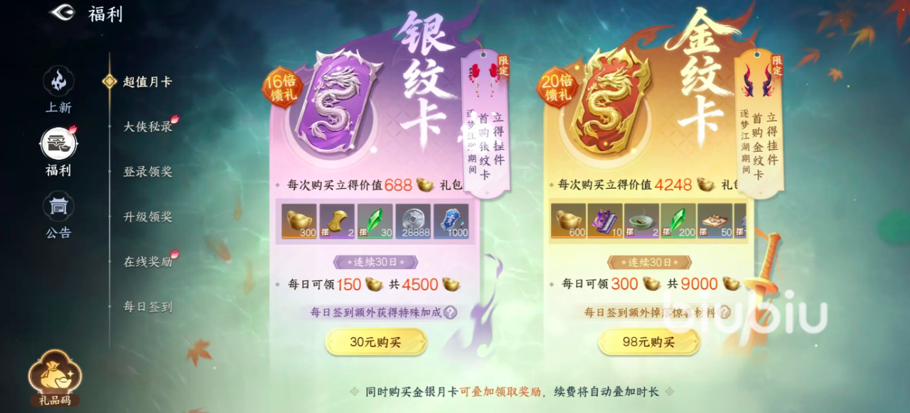 针对预算有限的玩家,推荐选择超值月卡方案。银纹卡提供16倍收益加成,金纹卡则高达20倍,同时每月还能领取限定金葫芦。持续激活月卡不仅能稳定获取金元宝和升级材料,更能实现资源积累的良性循环,大幅提升练级与战斗效率。