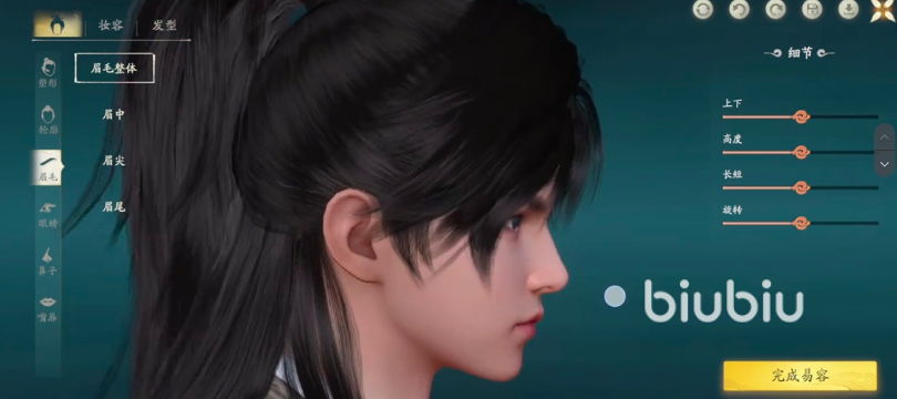 眉毛部分对角色气质影响显著。追求英武感的玩家可选用剑眉造型,增强眉峰弧度,缩小眉间距,并将整体位置略微下移贴近眼眶,提升锐利度。若偏好柔和路线,可在默认眉形基础上进行细微前后拉伸,保持自然协调。