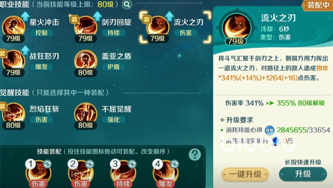 若以单挑为核心目标,可将烈焰狂斩替换为不屈觉醒,并优先升级利刃出击技能,随后补足信念守护与吸血类天赋。但整体仍需以提升不屈觉醒为主轴,完成主要技能加点后,再依次完善被动技能树。对于偏好PVE内容的玩家,技能选择有所不同,推荐配置为流火之刃、烈焰狂斩、剑刃回旋与战狂怒刃。天赋加点同样依据技能顺序推进。