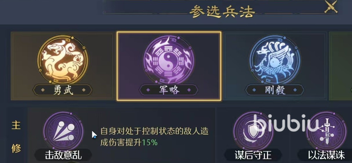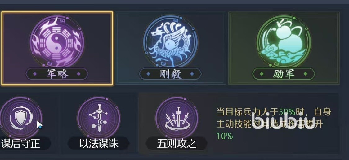 在兵法派系上,诸葛亮首选军略路线,因其技能机制围绕“无策”状态展开,具备出色的控制与持续输出能力。具体搭配需结合阵容调整。例如,在刘备、关羽与诸葛亮组成的传统蜀国战组合中,推荐主修军略中的【五则攻之】,以强化主动技能的伤害效率。辅助兵法可选用【雷霆】提升谋略伤害,搭配【集气】加快技能释放节奏,再辅以【善谋】进一步提高智力属性,从而全面提升输出能力。