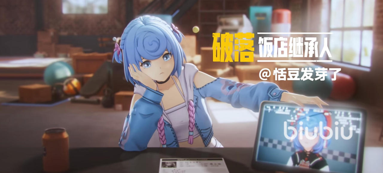 初看恬豆,会以为她是个温柔安静的女孩,一头蓝色短发配上螺旋状刘海和粉色小辫装饰,显得慵懒又俏皮。她身穿浅蓝色漏肩外套,整体造型清新元气。然而,在战斗状态下,她却展现出惊人战斗力,手持重型电锯冲锋陷阵,是队伍中输出能力最强的成员之一,反差感十足。