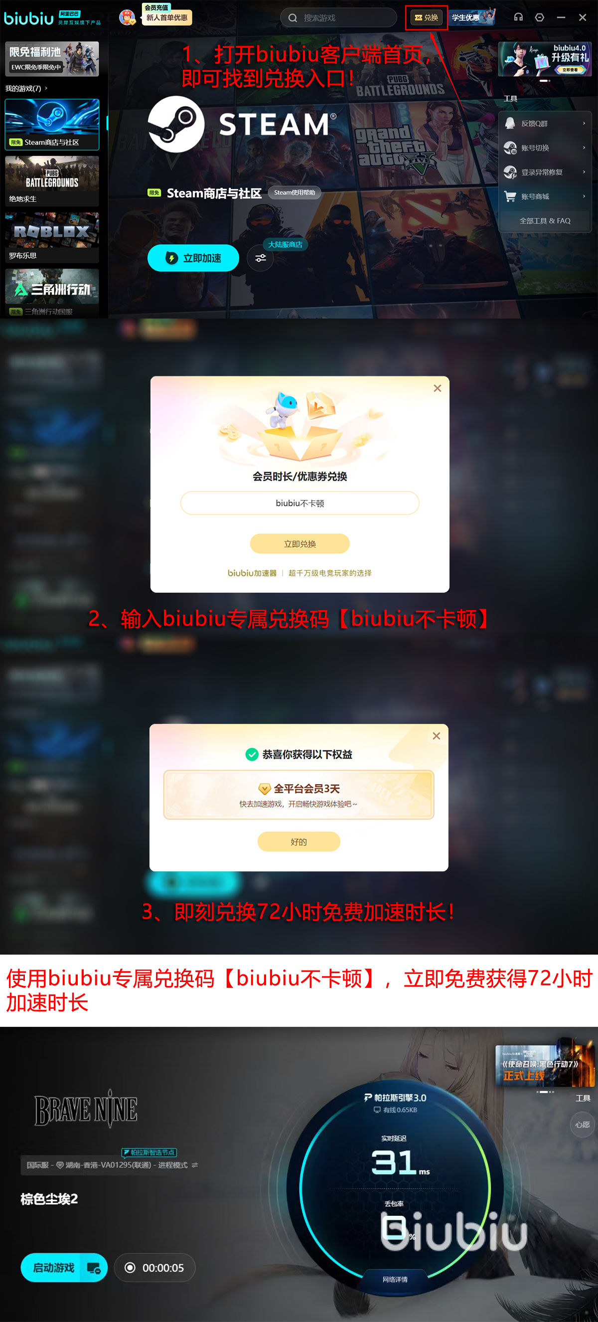 要是大家想先感受一下加速后带来的战斗快感!那就可以先注册,完事后就能马上获得24H的免费加速。若是还是觉得不够过瘾的话,新老玩家均可输入兑换码【biubiu不卡顿】,就能立刻获得三天免费加速,可以帮助大家在升级打怪的路上,越走越远!还没使用过的玩家可以注册体验,毕竟新用户最多可享受96小时免费加速哦。