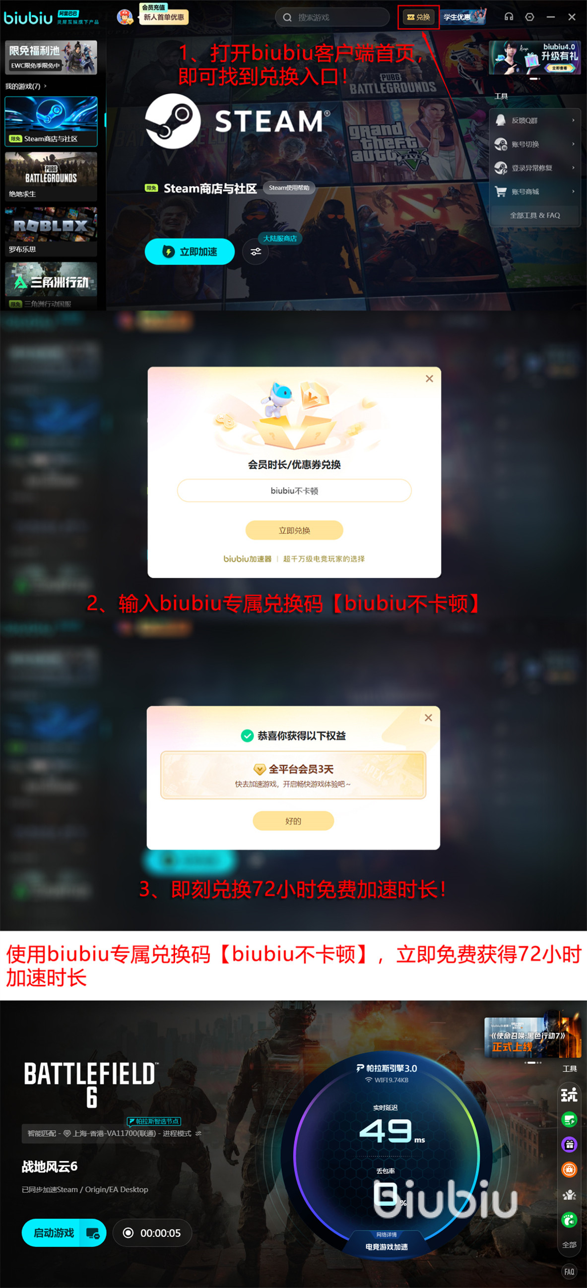 除了在技术上面的优势之外,biubiu在福利上也给用户带来的尝试的机会。新注册一个biubiu账号不用充值,直接就能免费加速24小时,这样做到了注册之后直接使用。还有一项是所有账号都能用一次兑换码【biubiu不卡顿】,获得72小时的加速时间,这样就能让新用户亲身体验加速性能了。