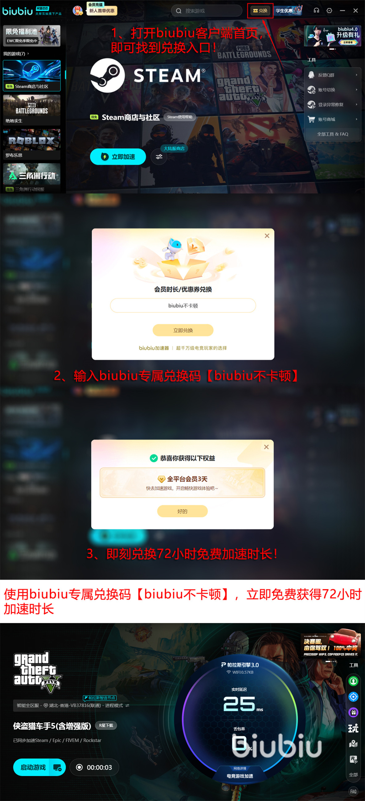 如果对于加速性能还不放心,现在就可以注册一个新biubiu账号,利用新号免费加速24小时的福利去免费体验一番。用完24小时之后再去使用兑换码【biubiu不卡顿】,兑换得到72小时加速时间,一共就能体验96小时啦。而且这些兑换码不仅新号能使用,每个账号都能用一次,欢迎老用户回归。除了这些福利之外,biubiu还免费开放了游戏社区、话题广场等服务,玩家在玩游戏的过程中遇到的一些问题,或者是自己的精彩时刻等, 都可以在这里分享出去,收获大量有共同爱好的玩家。