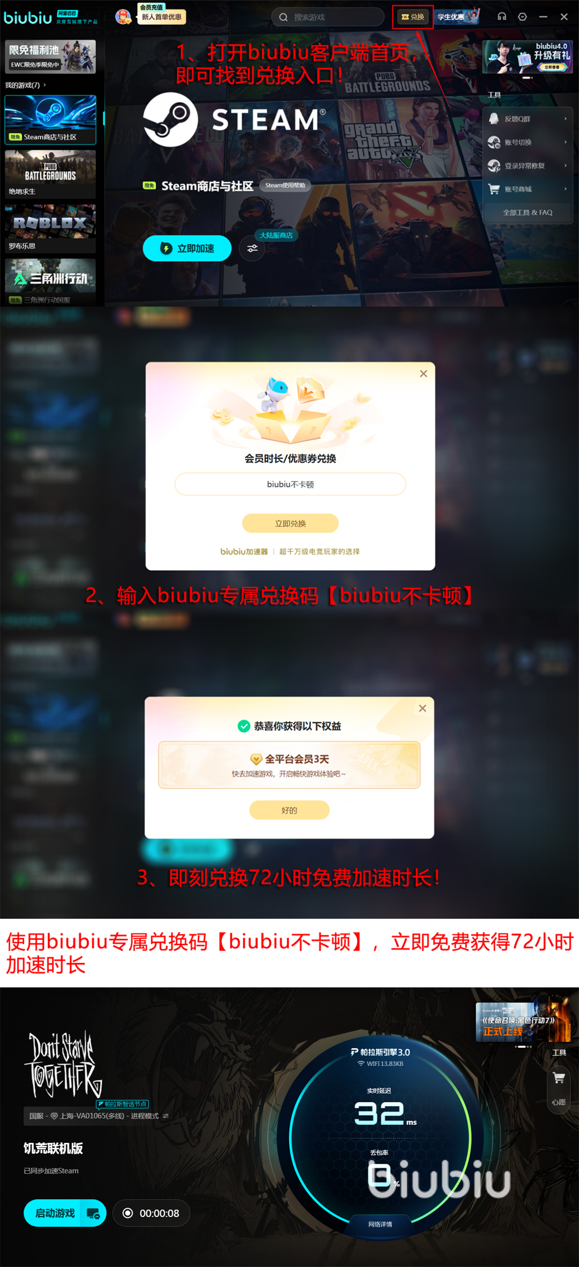 现在的biubiu还有很多福利活动必须通知大家,首先是注册一个新账号立即就能免费加速24小时,第二项是使用兑换码【biubiu不卡顿】能兑换72小时加速时间,这样新用户总计可得96小时的免费时间时间。另外兑换码不只是新用户能用,老用户也能兑换一次,所以不要错过。
