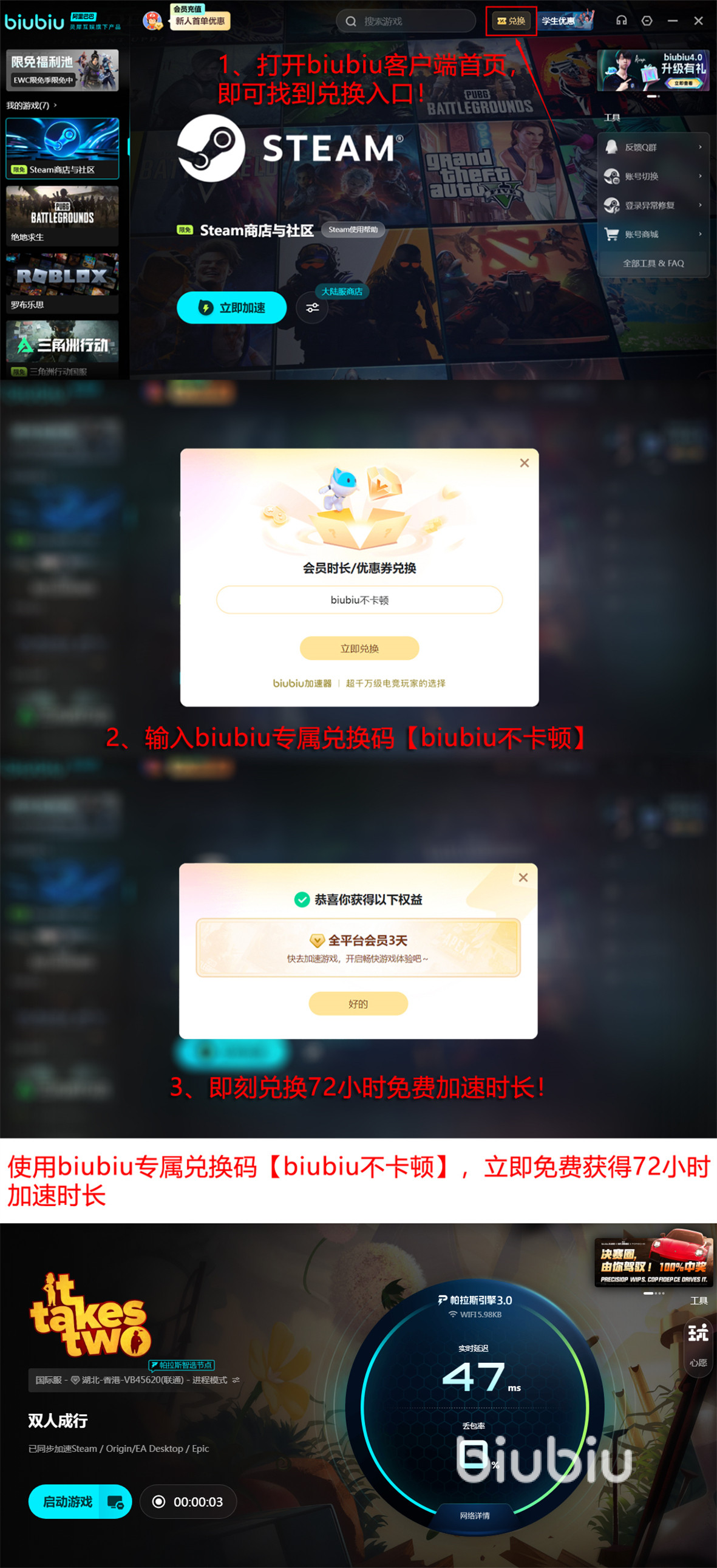 新注册的biubiu号最多可获得96小时免费加速:首先新人注册直接免费加速24小时的福利,这样能打消新用户对于性能方面的疑虑。还有一个兑换码【biubiu不卡顿】需要牢记,这个能获得72小时免费加速时间,每个号都能兑换一次。除了在性能和福利方面的优势之外,biubiu在适用性上也很广泛,主要加速的平台包含PC、switch、PS等个大主机平台,而且操作都是一样的便捷,无需进行繁琐的设置,只要能搜索到的选项都能直接点击加速。
