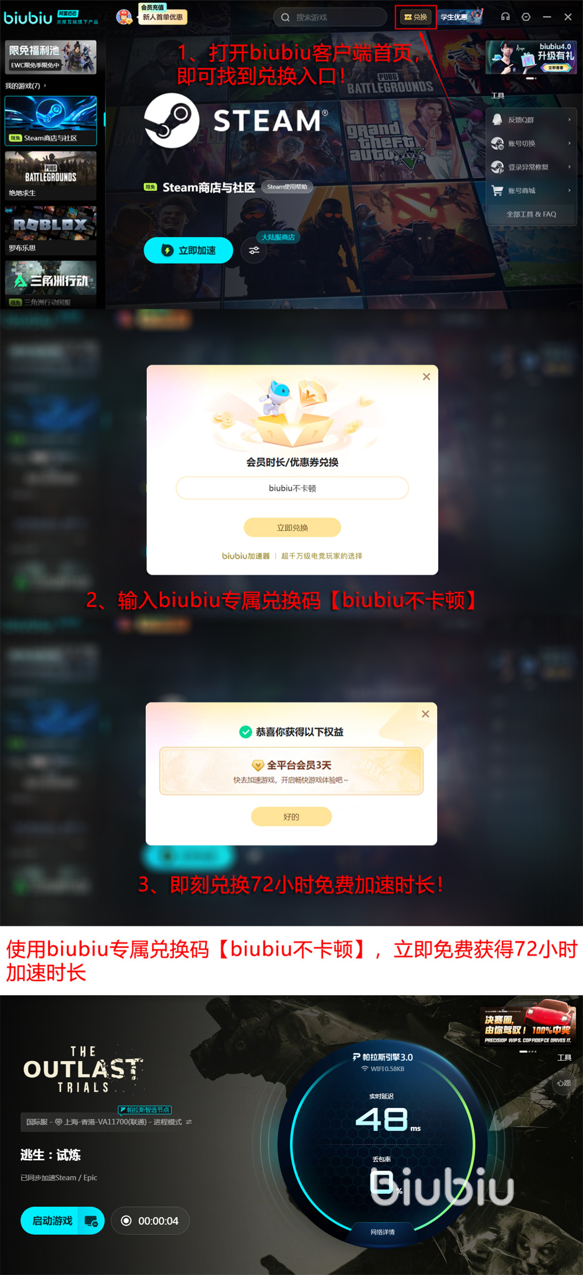 为了能够打消新用户对于性能方面的疑虑,biubiu对每个新注册的号都直接送24小时会员时间去免费体验。另一个福利是兑换码【biubiu不卡顿】,能兑换长达3天的会员时间,每个号都能用一次。这样就不用担心具体的加速效果了。