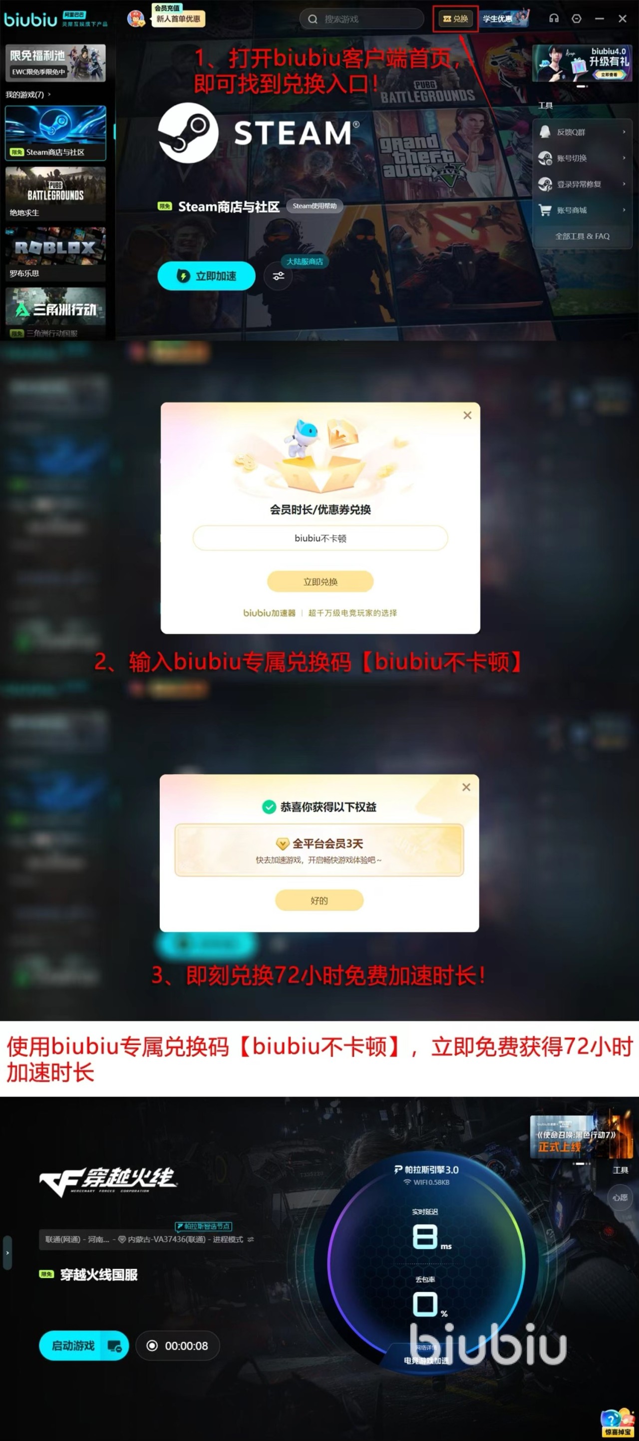 要是你最近正好要用到一个加速器,那么此刻正是入手体验的好时候,新用户注册后就能激活24小时加速时长,接着再输入专属兑换码【biubiu不卡顿】,用户还能继续领取3天的加速时长,这个兑换码适用于所有人,新老用户都能用它去换会员时长,有了免费领到的会员后,玩家就能完整测试加速后的登录和团战效果了。
