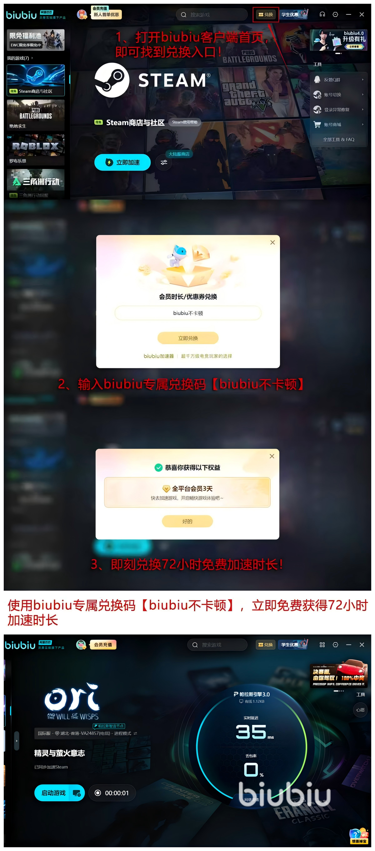 【biubiu不卡顿】口令直接输入后立刻到账72小时游戏时间,可以叠加新人的24小时,总计能够获取96小时的游戏时间,让玩家能够在游戏的时候获取足够多的体验加速,感受到加速效果之后再决定付费的模式,可以说是童叟无欺的,每一个体验过的玩家都会发现加速之后的使用效果非常的好。