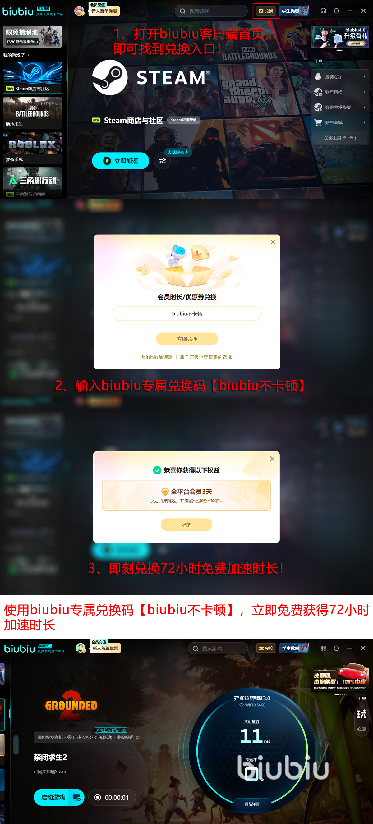 要是还没体验过的话,新人注册后还能领取24H的免费加速,完全可以试一下能不能先加载出来画面!若是觉得很不错的话,新老用户还可输入兑换码【biubiu不卡顿】,额外获得三天免费加速,让大家能畅玩更长时间!